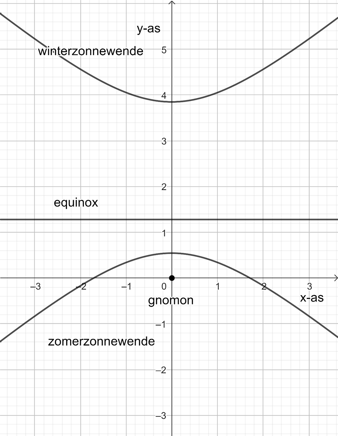 - De gnomon staat in de oorsprong van het assenstelsel.