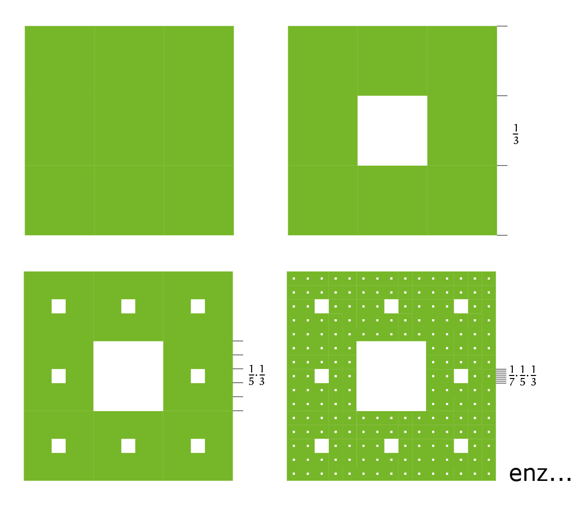 Nemen we uit een vierkant met zijde $2$ vierkante stukken weg op onderstaande manier, dan heeft het groene overblijvende gedeelte uiteindelijk een oppervlakte gelijk aan