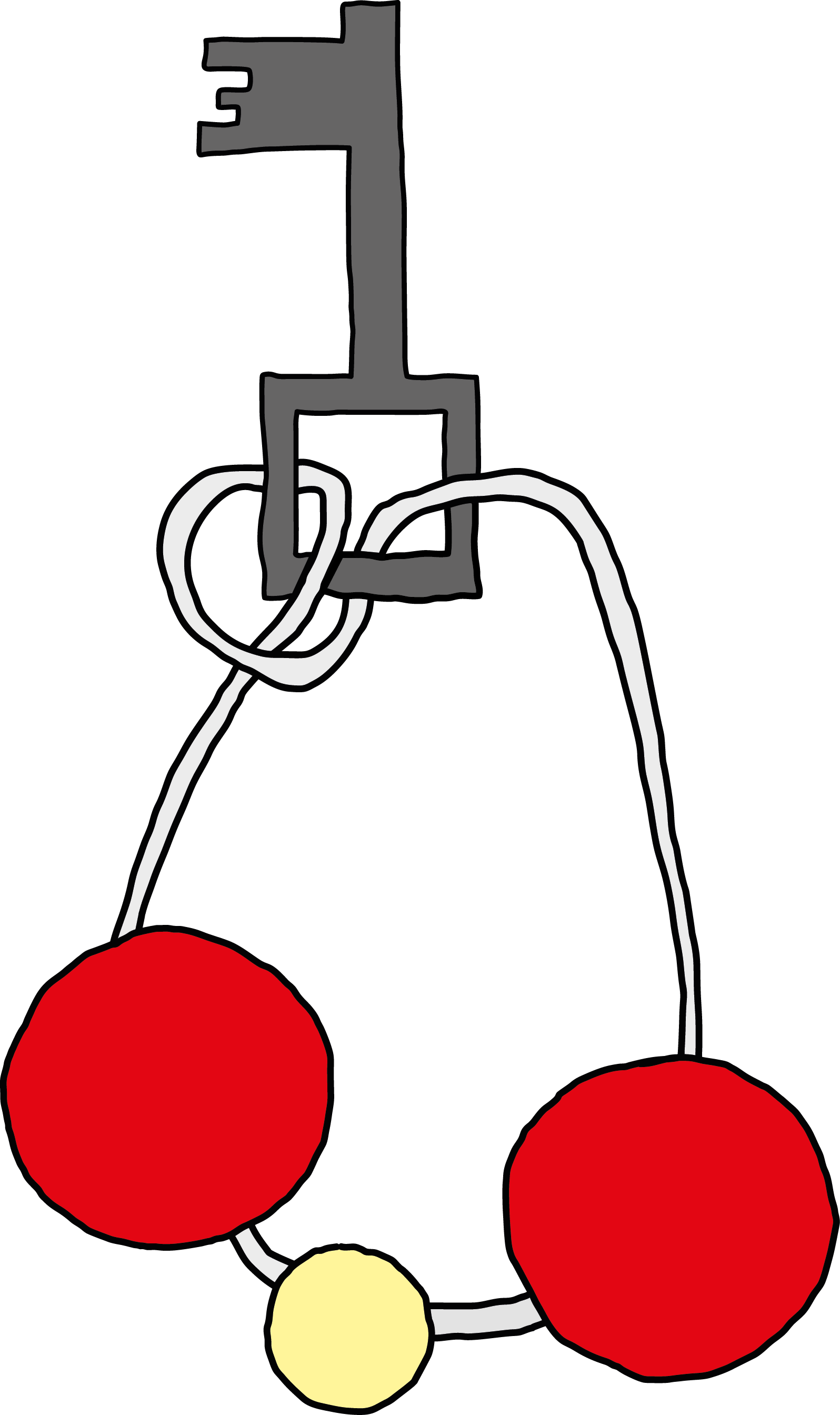 De twee grote kralen zijn van elkaar gescheiden door de kleine kraal. De opdracht is de twee grote kralen naast elkaar te brengen. De kleine kraal en de sleutel zitten in de weg, dat is precies de uitdaging. Omgekeerd, als het je gelukt is de twee kralen naast elkaar te krijgen, kun je weer proberen ze te scheiden met de kleine kraal.