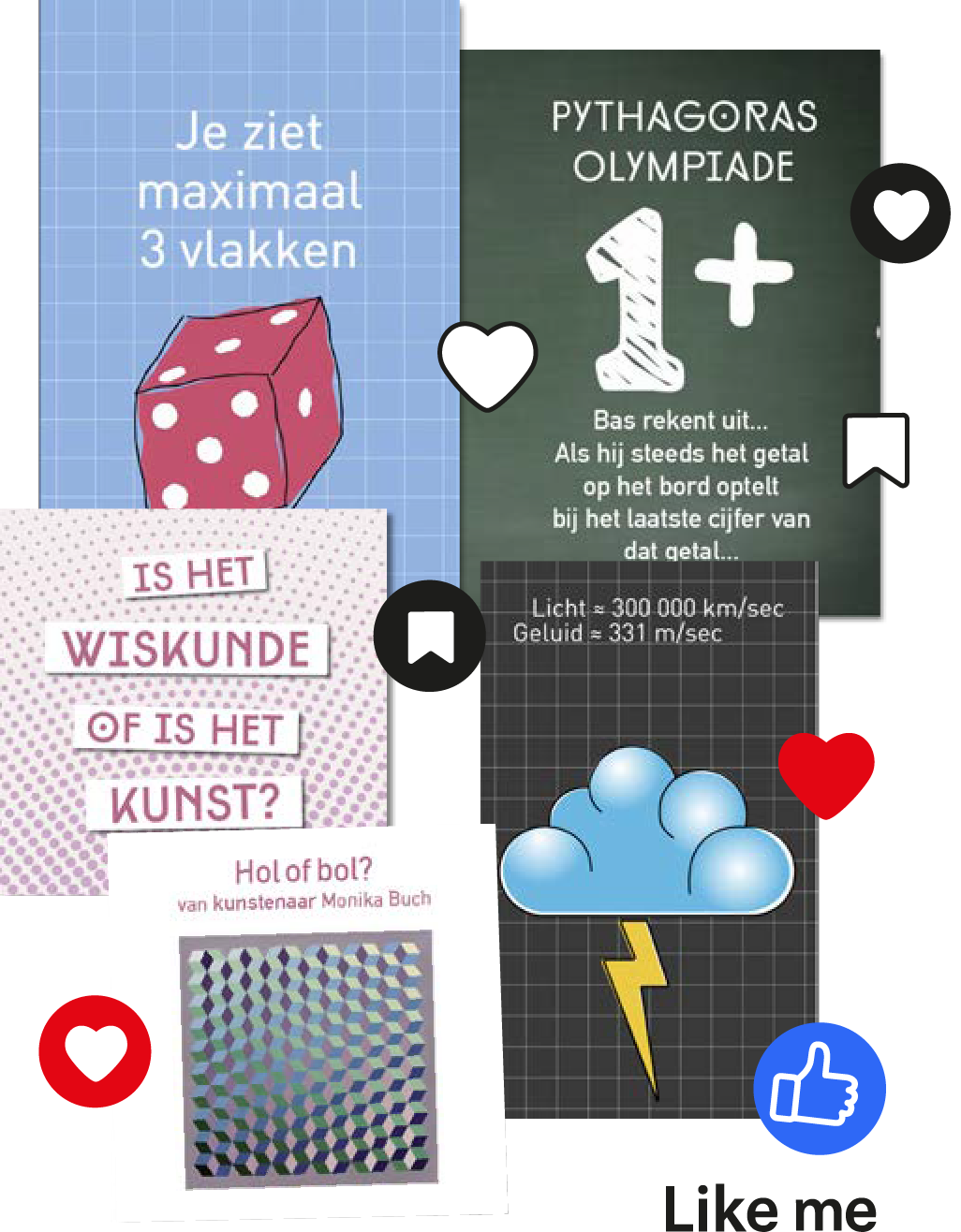 We bieden nieuwsgierige leerlingen denkvragen buiten het lesboek en delen die nu ook regelmatig via korte video's, onder meer op TikTok. Elke week één vraag die je brein prikkelt. Andere onderwerpen zijn: wiskunde om je heen, wiskunde en kunst, en wiskundigen die over hun werk vertellen.