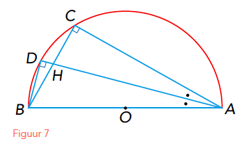 Is $z_n$ de lengte van een zijde van de ingeschreven regelmatige n-hoek, dan geldt dus $BC = z_n$ en $BD = z_{2n}$. Bissectrice AD snijdt lijnstuk BC in H (zie figuur 7). Omdat de hoeken C en D recht zijn (Thales) en de twee hoeken bij A even groot, zijn de driehoeken ADB en ACH gelijkvormig (hh). Er geldt: