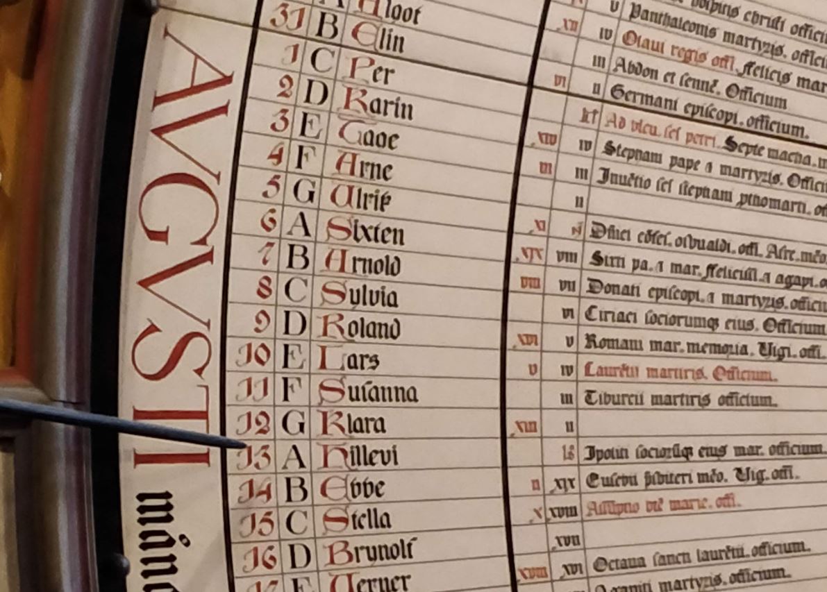 In figuur 1 zie je de legenda van het midden van de klok waar informatie per jaartal gegeven wordt. Voor ons van belang is de buitenste ring met het jaartal zelf, en de ring ernaast met de Littera Dominicalis, de zogenaamde zondagsletter. Deze letter duidt aan welke dagen van het jaar op een zondag vallen, waarbij 1 januari overeenkomt met de letter $A$, 2 januari met $B$, ..., 7 januari met $G$, 8 januari terug met $A$, enzovoort. (Let op: 29 februari krijgt géén letter, aangezien deze niet in elk jaar voorkomt.) In figuur 2 kan je aflezen dat 2019 een $F$-jaar is, waardoor we dus alvast weten dat de eerste zondag op 6 januari viel. Voor een schrikkeljaar heb je twee letters nodig door het toevoegen van een extra dag in februari: de eerste letter duidt op de zondagen voor 29 februari, de tweede letter op de zondagen vanaf 1 maart. 2020 is volgens de klok een $ED$-jaar, en inderdaad, de eerste zondag is op 5 januari, maar vanaf maart zijn het de $D$-dagen die op zondag vallen, te beginnen met 1 maart. Figuur 3 geeft dan weer een detail van de informatie aan de buitenkant van de klok waar er per dag van het jaar van alles staat opgesomd, waarbij wij kijken naar de dag van de maand in de buitenste ring, en de corresponderende letter (waarvan eerder al sprake) in de ring ernaast. Met behulp van die letter, in het geval van 13 augustus (de dag van mijn bezoek aan Lund) is dit de $A$, kunnen we dus de dag van de week bepalen, in combinatie met de zondagsletter van het jaar, de letter $F$ in het geval van 2019. We weten al van de gouden letter dat deze in dat geval de zondagen aanduidt, met andere woorden: alle $F$-dagen vallen op zondag in een $F$-jaar. In figuur 3 kan je dan ook zien dat 11 augustus een zondag was. Bijgevolg was 12 augustus ($G$) een maandag, en 13 augustus ($A$) een dinsdag. Het volstaat dus om door te tellen vanaf de dichtstbijzijnde zondag, maar in onderstaande samenvattende tabel kan je dit ook gemakkelijk aflezen: bovenaan staan de zondagsletters van het jaartal, links de letter van de datum waarvan je de dag wilt weten.