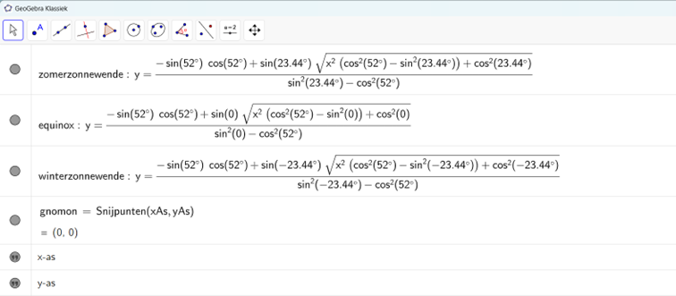 zomerzonnewende(x) = (-sin(52°) cos(52°) + sin(23.44°) sqrt(x² (cos²(52°) - sin²(23.44°)) + cos²(23.44°))) / (sin²(23.44°) - cos²(52°)) equinox: y = (-sin(52°) cos(52°) + sin(0°) sqrt(x² (cos²(52°) - sin²(0°)) + cos²(0°))) / (sin²(0°) - cos²(52°)) winterzonnewende(x) = (-sin(52°) cos(52°) + sin(-23.44°) sqrt(x² (cos²(52°) - sin²(-23.44°)) + cos²(-23.44°))) / (sin²(-23.44°) - cos²(52°)) gnomon : Snijpunten(xAs, yAs)