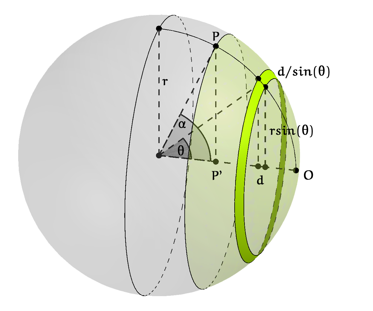 Figuur 4 toont een bol met straal $r$ met een bolkap bepaald door een middelpuntshoek $\alpha$. Uitgelicht is een dunne schijf (segment) van de bolkap met dikte $d$ rond een middelpuntshoek $\theta, 0 < \theta < \alpha$. De breedte van de schuine rand van de dunne schijf is bij benadering $d/\sin(\theta)$. De straal van de rand ligt rond $r\sin(\theta)$, dus zijn omtrek is ongeveer $2\pi r\sin(\theta)$. De oppervlakte van de rand is dus $2\pi r\sin(\theta)\cdot d/\sin(\theta)=2\pi rd$. Merk op dat deze waarde onafhankelijk is van $\theta$ en dus geldt voor elke dunne schijf. De oppervlakte van de bolkap, opgebouwd gedacht uit dunne schijven, is daarom $2\pi r$ maal de hoogte ervan. De hoogte van de bolkap, de afstand tussen $O$ en $P'$, bedraagt $r - r\cos(\alpha)$. De oppervlakte van de bolkap is dus: