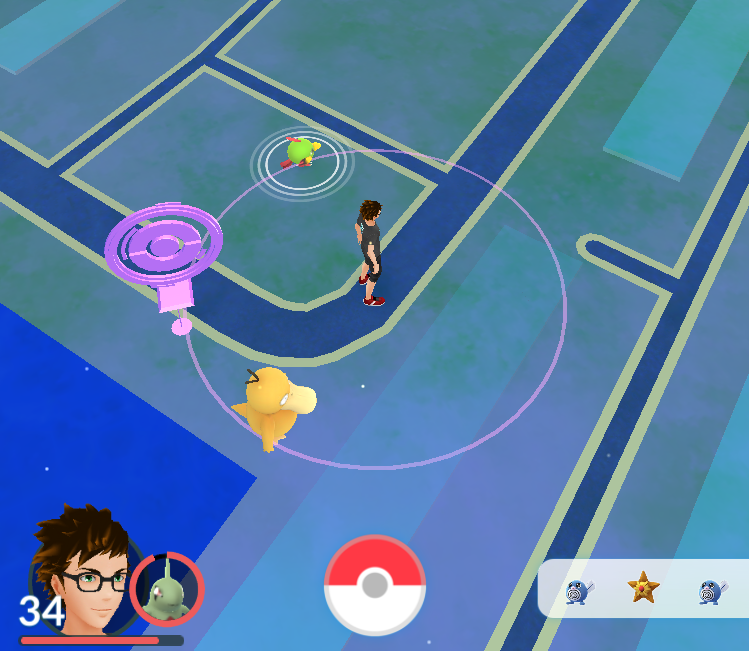 We maken nog een paar aannamen om een ideale wereld te maken waarin we dingen kunnen bewijzen. De GPS in onze telefoon is perfect nauwkeurig en geeft altijd meteen door waar we zijn op het netwerk. De Pokémon Go app (zie figuur 5) zal ons meteen vertellen als een nieuwe Pokémon in onze waarnemingscirkel komt en ook als een Pokémon in onze vangcirkel komt (twee Polywags en een Staryu) en ook als een Pokémon in onze vangcirkel komt (Psyduck en Natu). Verder kennen we het netwerk helemaal en weten we alle afstanden.
