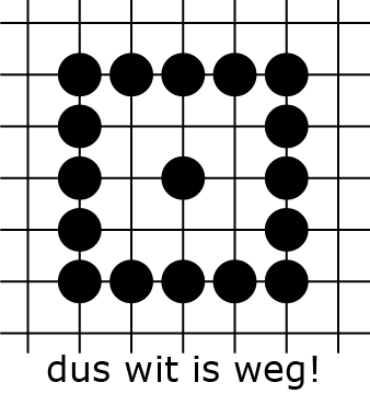 Voor de duidelijkheid: een keten met maar één vrijheid (we zeggen dat die 'atari staat') kan bij de volgende zet geslagen worden (als regel 5 dat toestaat), zelfs als je daarvoor zelf even een keten zonder vrijheden op het bord krijgt tijdens het zetten. Dus in stelling 2A mag zwart op het middenpunt spelen 2B en slaat dan de witte groep 2C. Maar in 2D mag dat niet, zwart moet eerst de zet van buitenaf spelen zodat wit echt nog maar één vrijheid heeft. Dat is genoeg over de regels, we gaan nu vechten! Een lokaal gevecht ontstaat als twee groepen elkaar aan het omsingelen zijn. Wie is er eerder bij en kan de andere slaan? Dat blijkt nog behoorlijk subtiel te kunnen worden: een keten kan veel meer vrijheden hebben dan op het eerste gezicht lijkt. Zelfs 'kwadratisch veel meer'! In het vervolgartikel gaan we daar een formule voor afleiden. Nu gaan we eerst begrijpen wat er speelt.