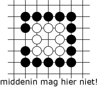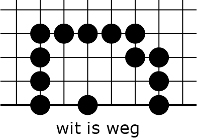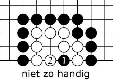 te spelen). Zwart heeft dat verdedigd door met 3 die steen te verlengen tot een keten van twee stenen (met drie vrijheden).