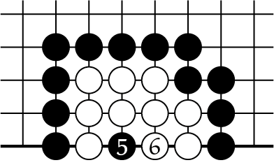 . Daardoor slaat wit zwart, en ontstaat 6C. Hee, dit herkennen we, dat is precies wat we eerder hebben gezien: drie binnenvrijheden, dus drie zetten. In totaal heeft wit vijf zetten ergens anders kunnen spelen voordat hij werd geslagen, dus om vier binnenvrijheden op te vullen heb je vijf zetten nodig.