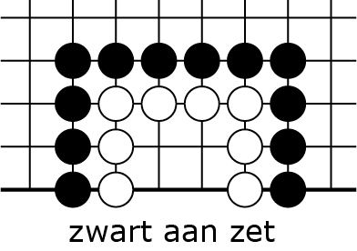 De witte keten van twee stenen in 1A heeft nog twee vrijheden. Zwart en wit spelen nu wat zetten