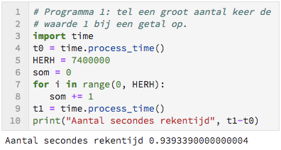 In regel $3$ wordt de module time geladen. Een module is een bestand waar allerlei programma's in zijn opgeborgen, meestal met één onderwerp. De module time bevat een programma waarmee je de tijd kan meten die de processor gebruikt voor een programma. In regel $4$ wordt de functie process_time() uit deze module uitgevoerd. Deze functie heeft als uitvoer de tijd die de processor sinds de laatste start van de computer werkzaam is geweest.
