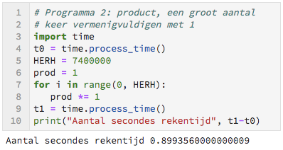 Regel $9$ is vergelijkbaar met regel $2$. Alleen de processor is nu wat langer werkzaam geweest. In regel $10$ wordt afgedrukt wat er tussen de () staat achter print. In de Jupyter-omgeving gebeurt dat recht onder de code.