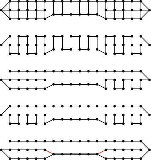 De kunst is om in dat diagram een pad langs de lijntjes te vinden dat precies één keer langs elk punt (vlak) komt. Dit wordt wel een Hamiltonpad genoemd. Hamilton was een Iers wiskundige uit de 19e eeuw die zich met zulke problemen bezig hield. In het tweede diagram zie je hoe je alle vlakken precies één keer kunt poetsen. Er zijn nog wel andere perfecte oplossingen, maar er moet ergens gezigzagd worden. Snap je waarom? Het derde diagram toont een oplossing met het minste aantal zigzags. Met wat meer zigzags lukt het zelfs om terug te komen waar je was begonnen (vierde diagram). Dat is een zogenaamde Hamiltoncykel. Als je zelf ook een mooie oplossing hebt gevonden dan wil de familie Van der Torus die graag horen.