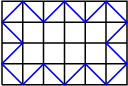 Geval: $a$ of $b$ is even, de ander oneven Laten we voor het gemak $a$ (horizontaal) even zijn en $b$ oneven (verticaal). Als we de bovenste strook velden weglaten, dan kunnen we de resterende velden rondom het binnengebied plaatsen. In de bovenste rij kunnen we nog $a$ extra spiegels plaatsen. De spiegels worden geplaatst zoals hieronder is weergegeven. Er kan een lichtstraal doorheen. Nu moeten we opnieuw door spiegels te plaatsen (verwijderen en verplaatsen) de lichtstraal (zoals hierboven is getekend) combineren met de lichtstraal in het gesloten deel. Dat lukt bijvoorbeeld met deze oplossing: Ook hier heeft de lichtstraallengte de maximale lengte van $2ab - 2a - 2b + 6$ (is optimaal!) |