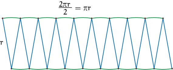 Maar hij leunt een beetje en heeft twee kartelranden. Verder snijden in nog dunnere sectoren helpt om hem beter te laten passen in een rechthoek met ${\rm oppervlakte} = r \cdot \pi r$. Intuïtief vind ik dit een heel overtuigende demonstratie voor