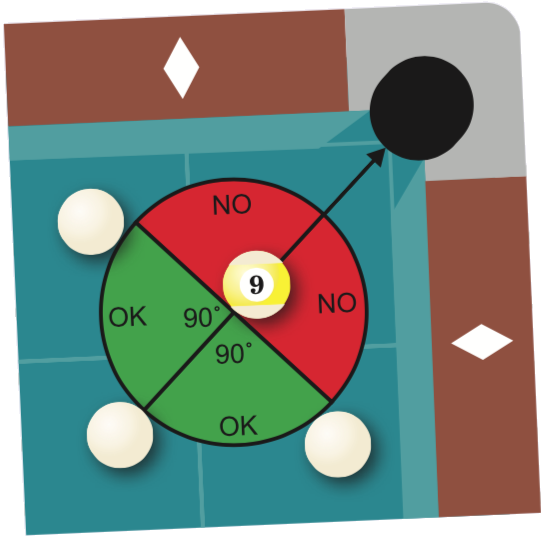 Elke object ball die een vrije baan heeft naar een pocket is te potten, maar niet vanuit elke hoek. In figuur $5$ is met groen aangegeven vanwaar de object ball te potten is en met rood vanwaar dat niet mogelijk is.