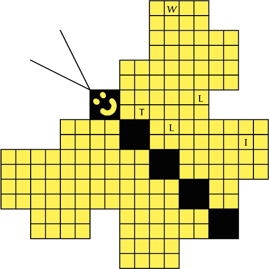 Hierboven staan alle pentomino's met hun letters. Vul de gele hokjes van de vlinders met pentomino's zodat geen twee pentomino's met dezelfde vorm (ook niet gedraaid of gespiegeld) een zijde gemeen hebben. Een vierkantje met een letter er in moet deel uitmaken van de pentomino met dezelfde naam.