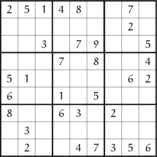 Op elke rij, in elke kolom en in elk $3\times3$ vlak moeten de cijfers $1$ t/m $9$ komen te staan. Deze puzzel is met logische stappen goed tot een einde te brengen.