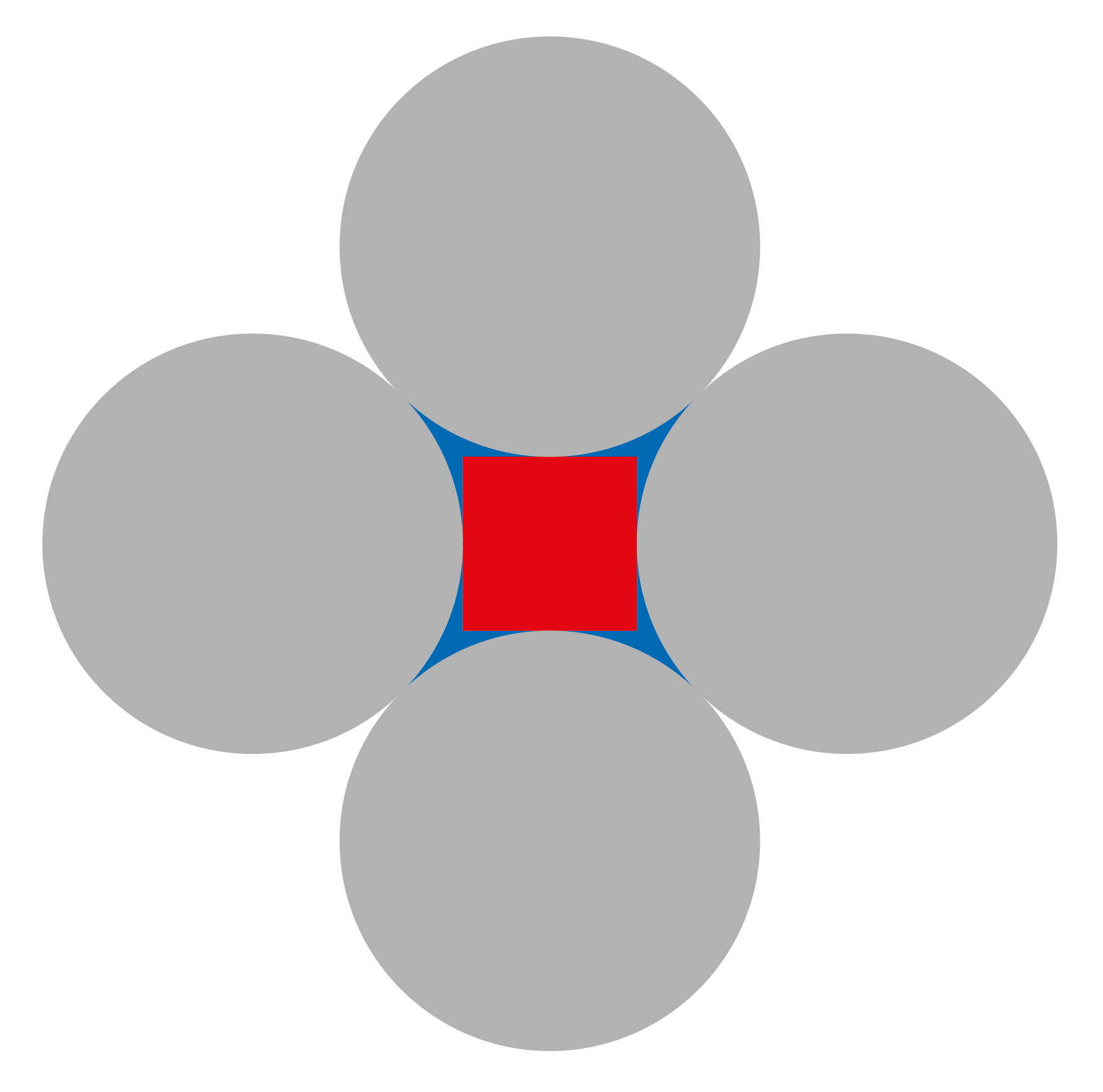 Een vierkant wordt ingesloten tussen vier rakende cirkels wiens middelpunten tevens een vierkant vormen. Mike beweert dat de rode oppervlakte meer dan vier keer zo groot is als de blauwe oppervlakte.