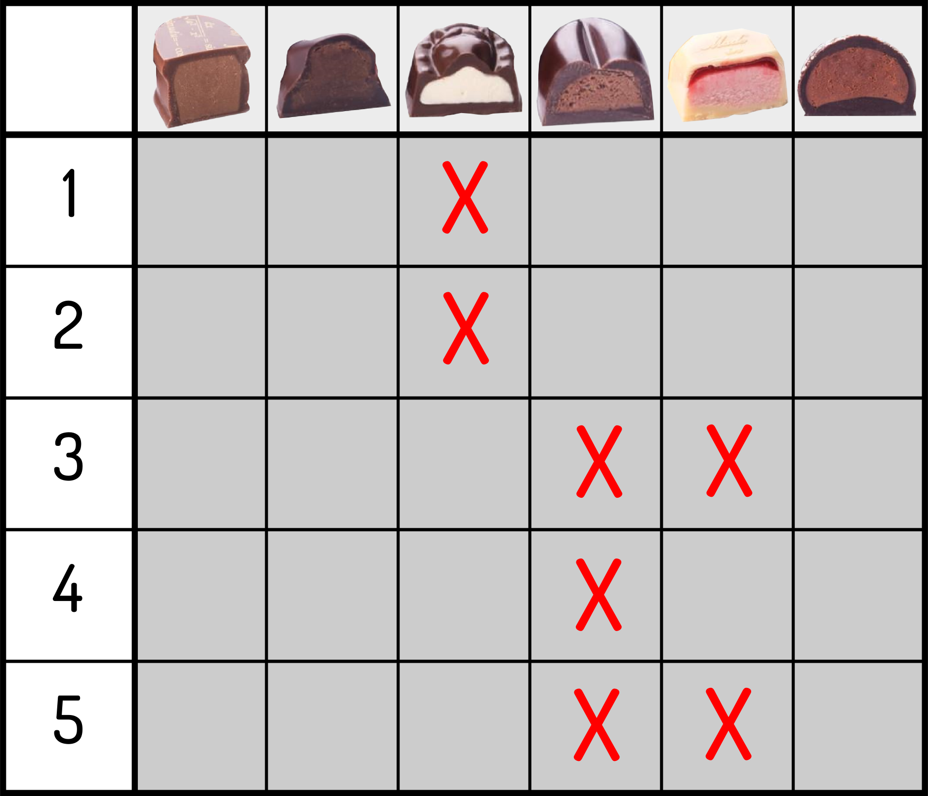 Probeer het even: zoek hiernaast dus naar een manier om uit elk groepje $1$ kaart te selecteren zodat we uiteindelijk één kaart voor elk van de $13$ waarden hebben. Kleuren (schoppen, klaveren, ruiten en harten) hebben geen belang. In dit geval lukt het. Je ziet een oplossing van het probleem rechts. Schud nu zelf de $52$ kaarten, verdeel ze opnieuw in $13$ groepen, en probeer het nog eens. Lukt het? Als het niet lukt, zoek dan nog even verder, want dankzij een stelling uit de wiskunde zijn we er zeker van dat het altijd kan! Een ander voorbeeldIk krijg wel eens een doos pralines cadeau. Maar zoals dat ook bij vele andere mensen het geval is, heb ik niet alle pralines even graag. Gelukkig zijn er dan familieleden die ook pralines lusten en een andere smaak hebben dan ik. Laat ons even veronderstellen dat er nog $6$ pralines over zijn in de doos, allemaal verschillende smaken. We zijn met vijf thuis en ik laat iedereen een lijstje maken met daarop de pralines die zij lusten. De vraag is dan: is het altijd mogelijk om iedereen (minstens) één praline te geven die op zijn of haar lijstje staat? In figuur 1 zie je een mogelijk lijstje voorkeuren. Links staan mijn familieleden, die we voor de eenvoud geen naam maar een nummer hebben gegeven. In dit geval kunnen we elk familielid een praline van haar/zijn lijstje geven. Zie je hoe? Er zijn meerdere oplossingen. Merk op dat we per rij één kruisje (= praline) willen en dat alle gekozen kruisjes in verschillende kolommen moeten staan. |