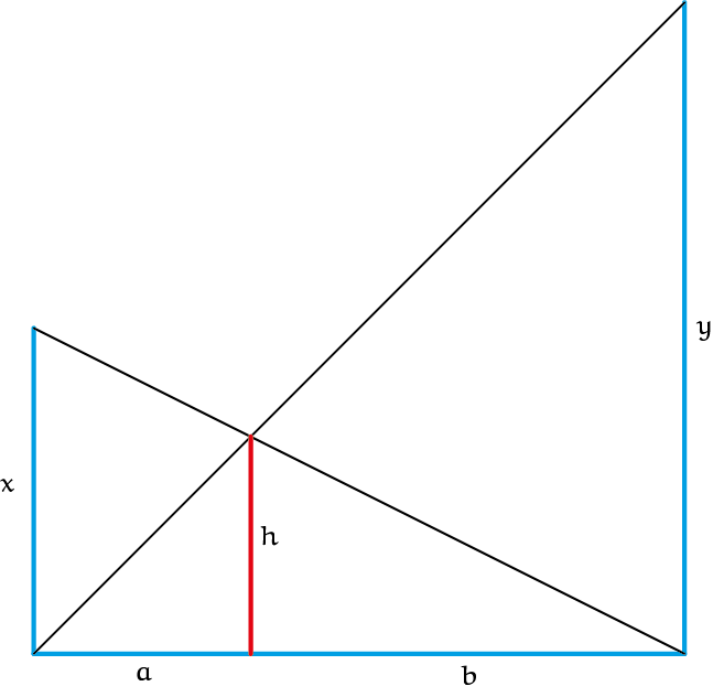 Stel de volgende situatie voor. Twee palen zijn verticaal geplaatst op een horizontaal stuk grond. De lengtes van de palen boven de grond zijn $x$ meter en $y$ meter met $x < y$. De palen zijn vervolgens met elkaar verbonden door touwen die lopen vanaf de top van elke paal naar de voet van de andere paal. De horizontale afstand tussen de twee palen is niet bekend maar het is nuttig om de twee delen van die afstand een naam te geven zoals in figuur 1.