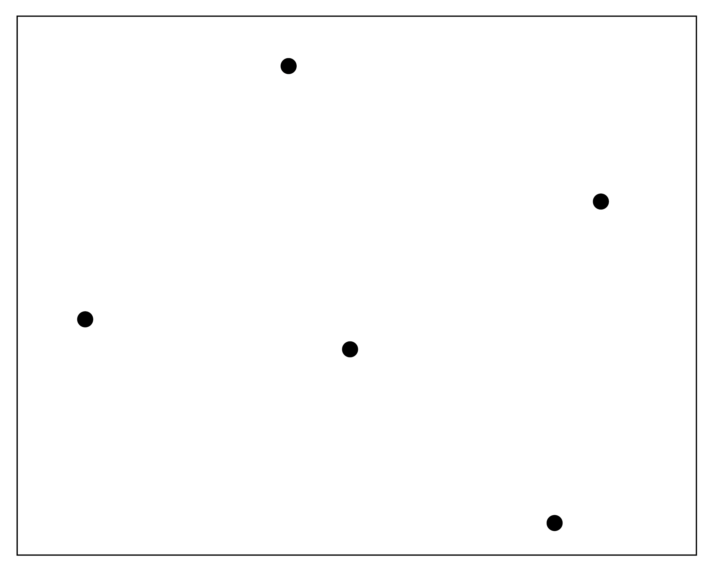 Teken voor de vijf punten het bijbehorende Voronoidiagram met behulp van middelloodlijnen. Hint: als je de figuur $30^{\rm o}$ tegen de klok draait krijg je 'mooie' roosterpunten. |